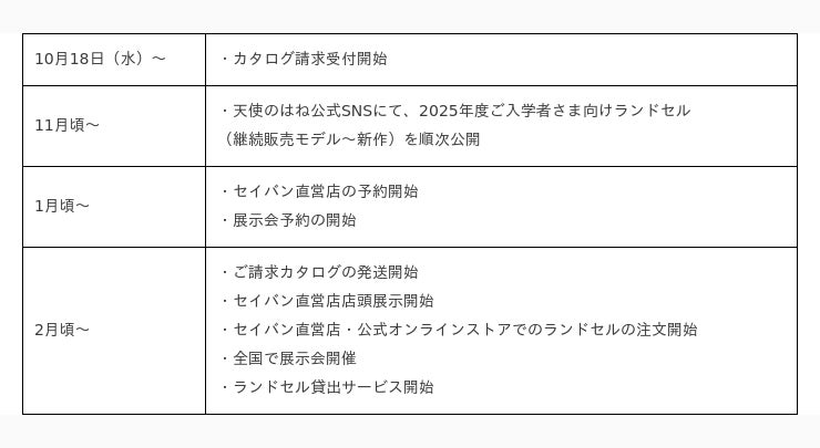 2025年度ご入学者さま向けランドセルのラインナップについては、11月頃から天使のはね公式SNSを通じて、継続販売モデルより順次公開してまいります。