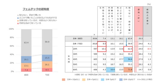 「フェムテック」について「知らない・初めて聞いた」と回答した人が59.9%と、2023年10月に実施した前回調査(以下「前回」)より減少しました。しかし、「内容まで知っている」と答えた人はわずか8.5%にとどまる結果となりました。