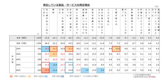 また、年代によって満足度の理由は異なっており、20代には「利便性」、50代以上には「悩み・不安を解消」する製品に満足感を覚える傾向がありました。