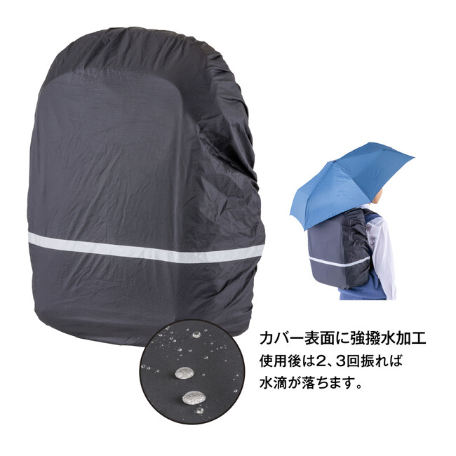 5)軽量、薄手の取り外し可能なレインカバーを背面下部に内蔵。カバー表面には強撥水加工を施しています。