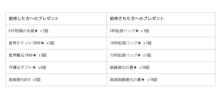 友達招待プログラムの特典アイテムがリニューアルしました。招待された方は、冒険に役立つ「15枠拡張バック」や、装備の強化に必要な「高級装備強化の書」が獲得できます。そのほか、招待した方の特典アイテムもリニューアルしましたので、お友達を誘い、冒険に旅立ちましょう!