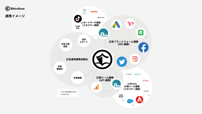 広告運用自動化ツール「Shirofune(シロフネ)」は、主要広告配信プラットフォームの運用業務の自動化機能や、各プラットフォーム・計測ツールの統合ダッシュボード化機能等で、ユーザーの広告運用の生産性向上と効果改善を同時に実現するサービスです。