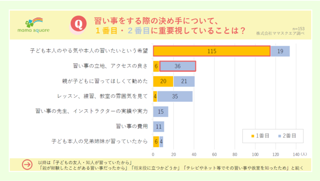 「2番目に重要視」するのは「習い事の立地・アクセスの良さ」「レッスン・練習・教室の雰囲気」が拮抗する結果となった。