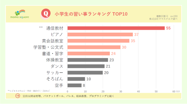 第2位は「ピアノ」、第3位は「英会話教室」の結果となり、学習・教育系の習い事が上位を占める結果となりました。