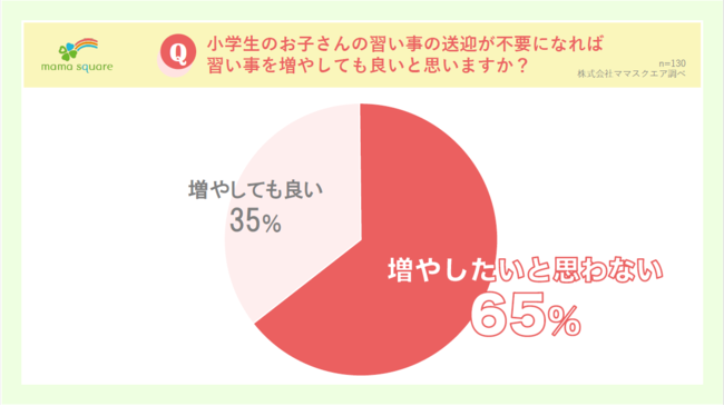 現在子どもの習い事の送迎をしている働くママに対し「送迎がなくなったら、子どもの習い事を増やしてもよいと思えますか?」に対して65%が「増やしたいと思わない」と回答しました。