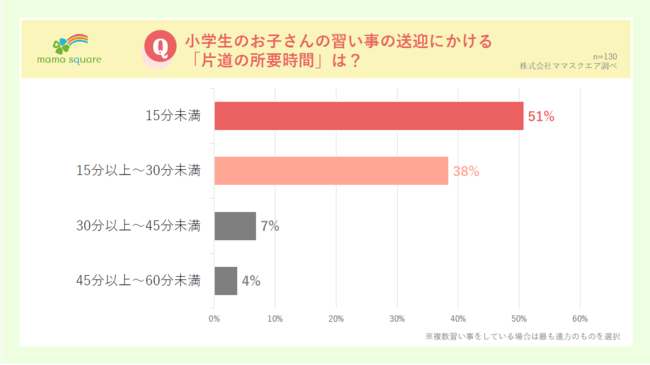 働くママが送迎にかける時間(片道)は、「15分未満」が最も多く全体の51%、次いで「15分以上~30分未満」が全体の38%となった。