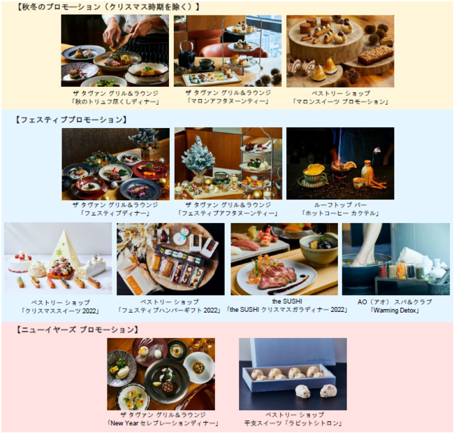 クリスマスや新年の訪れを冬霞やきらめく都心の夜景と共にお楽しみいただく、冬季限定のディナーやアフタヌーンティーなどこの時季ならではのメニューを豊富にご用意いたします。ザ タヴァン グリル&ラウンジでは、香り高い旬のトリュフを贅沢に使用したトリュフ尽くしのディナーやクリスマスを素敵に演出する三夜限定のフェスティブディナーを、ザ タヴァン ラウンジでは、心躍るクリスマスをビジュアルでも楽しませてくれるシェフ渾身のアフタヌーンティーを、ペストリー ショップでは、熊本県阿蘇産の栗をふんだんに使用した和テイストのスイーツに加え、ホワイトクリスマスをイメージしたケーキなど、フェスティブシーズンをより華やかに彩るスイーツを種類豊富に揃えました。また、大人の隠れ家、the SUSHIではシェフこだわりの肉料理も堪能できる、旬の美味な食材を日本料理のコース仕立てでお楽しみいただくクリスマス限定のディナーをご用意いたします。AO スパ&クラブでは、「ウォーミング(温め)」をテーマにあらゆる和の素材を使用し一年の疲れをデトックスして新たな年を迎えるにふさわしい、ユニークなメニューをご提供いたします。