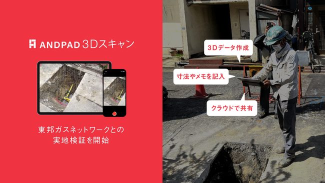 2022年3月より両社は、都市ガス導管事業における維持管理業務の更なる効率化に向け共同プロジェクトを開始し、新機能「ANDPAD 3Dスキャン」の開発に取り組んでいます。「ANDPAD 3Dスキャン」は、iPhone Pro、iPad Proに付随するLiDAR(ライダー)機能を活用し現地調査時の野帳や竣工図書の作成が可能な新機能であり、報告書と図面のペーパーレス化を図り、大幅な業務効率の改善を現場、事務所で実現することを目指しています。また、副次的効果として、2024年4月から建設業にも施行される「働き方改革関連法」の時間外労働の上限規制の適応にも効果が期待されます。
