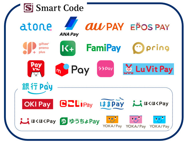 既にご利用いただける決済手段に加えて、Smart Codeを導入しているコード決済サービス「atone」「ANA Pay」「au PAY」「EPOS PAY」「ギフティプレモPlus」「銀行Pay(OKI Pay、こいPay、はまPay、ほくほくPay、ゆうちょPay、YOKA!Pay等)」「K PLUS」「FamiPay」「pring」「Payどん」「メルペイ」「ララPay」「Lu Vit Pay」のほか、「PayPay」「楽天ペイ」「d払い」「Alipay」「WeChatPay」がご利用いただけるようになります。また、今後Smart Codeを導入するコード決済サービスもご利用いただけます。