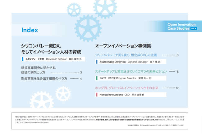 「Open Innovation Case Studies ~ BLITZLIVE2021 ~ vol.1」では今回、資料ダウンロードいただく全ての方が完全版をご覧いただけます。当レポートでは、TECHBLITZ主催の月1回のオンライントークセッション「BLITZ LIVE」で登壇いただいた日本企業の事例やスタンフォード大学の櫛田健児氏(所属は講演当時)の講演をひとつにまとめました。