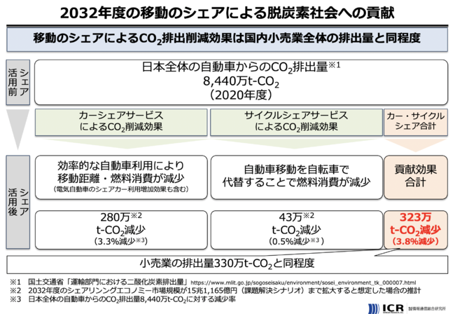 今回新たに、移動におけるシェアサービス(カーシェア・シェアサイクル)の脱炭素社会への貢献を調べた結果、トータルのCO2排出削減効果は “国内小売業全体の排出量と同程度” であることが分かりました。
