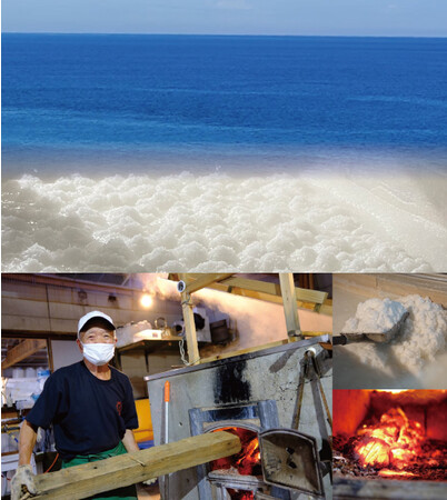 その近くで汲み上げた海水を、竈に薪を焚べ炊き上げる伝統的な平釜製法で職人が炊き上げる旨味の詰まった塩をふんだんに使用しております。