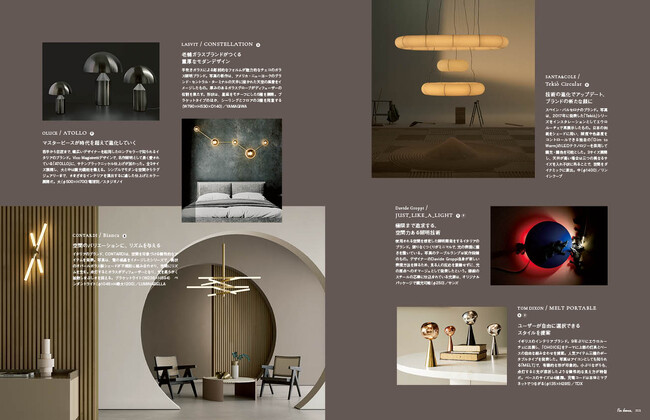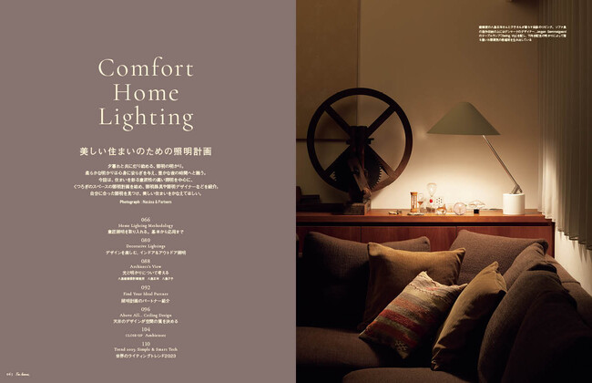 夕暮れと共に灯り始める、照明の明かり。柔らかな明かりは心身に安らぎを与え、豊かな夜の時間へと誘います。特集「美しい住まいのための照明計画」では、住まいを彩る意匠性の高い照明を中心に、くつろぎのスペースの照明計画を始め、照明器具や照明デザイナーなどを紹介。照明選びが楽しくなる一冊です。“明かりの質”にこだわって、住まいを彩りましょう。