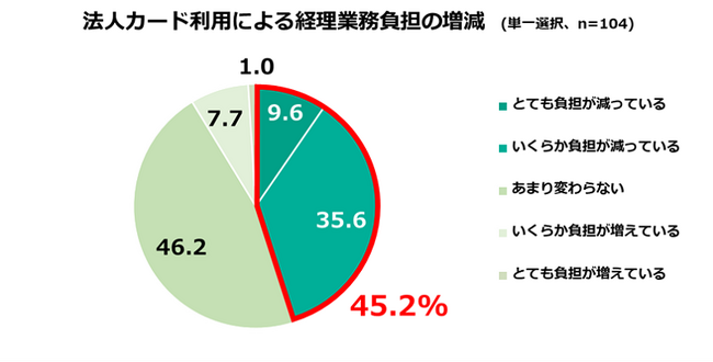 法人カード利用による業務負担の増減について尋ねる質問では、法人カードにより約2人に1人(45.2%)が経理業務の負担が減ったと回答し、負担が増えているとした回答はわずか8.7%でした(図4)。