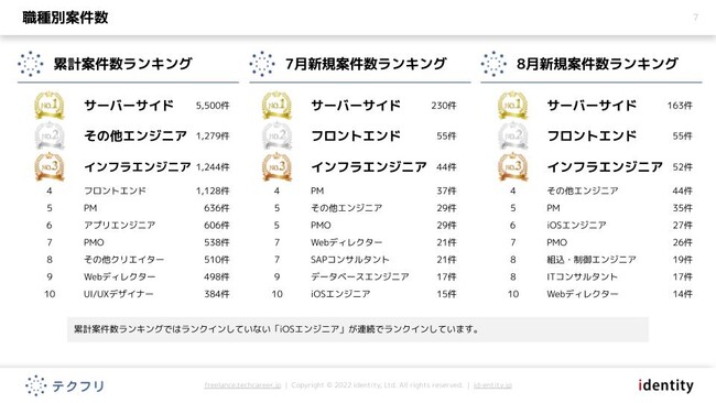・職種別案件数において、累計案件数ランキグではランクインしていない「iOSエンジニア」が連続でランクインしています。