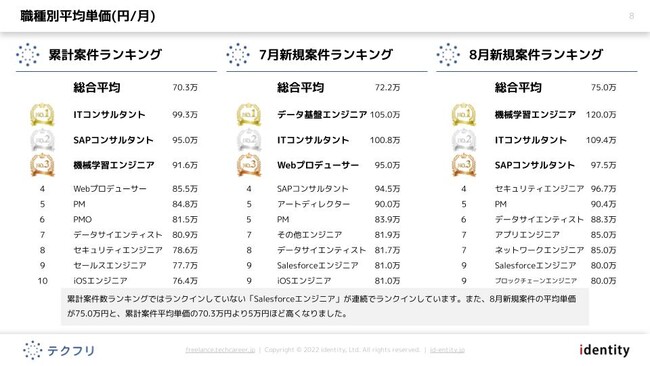 累計案件数ランキングではランクインしていない「Salesforceエンジニア」が連続でランクインしています。また、8月新規案件の平均単価が75.0万円と、累計案件平均単価の70.3万円より5万円ほど高くなりました。