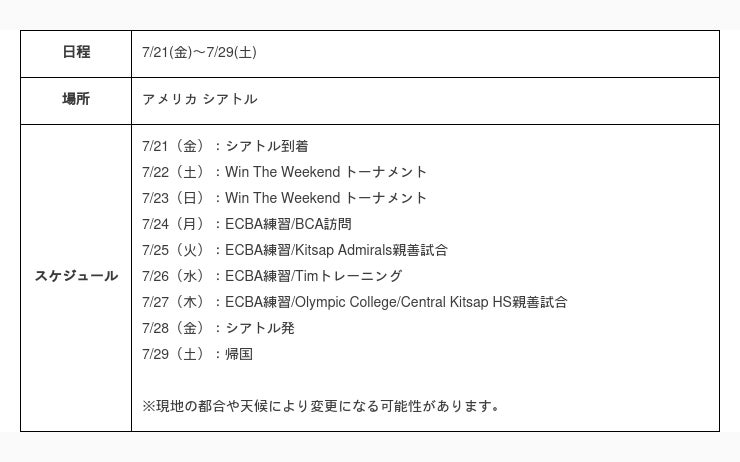 今回のUSAキャンプでは、アメリカのバスケ環境を知る機会や同世代の海外選手との交流機会を作り、育成期であるユース選手たちのキャリア形成や育成に繋げたいと考えており、実施の運びとなりました。