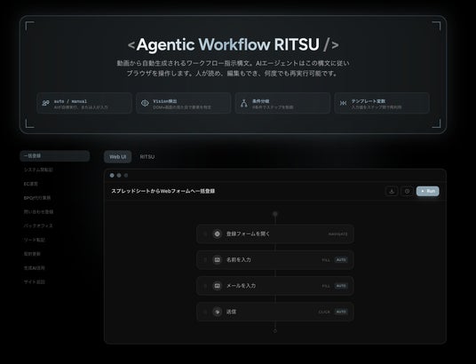 コーレは、AIエージェントに対して業務手順を正確に伝達するための汎用的なAgenticワークフロー指示構文「Agentic Workflow RITSU」を開発しました。Copelfではこの構文を中核技術として採用しており、録画から解析されたワークフローはRITSUに基づいて構造化されることで、AIエージェントが高い再現精度でブラウザ操作を実行します。
