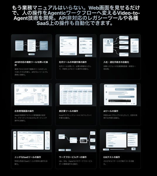 もう業務マニュアルはいらない。Web画面を見せるだけで、人の操作をAgenticワークフローへ変えるVideo-to-Agent技術を開発。API非対応のレガシーツールや各種SaaS上の操作も自動化。