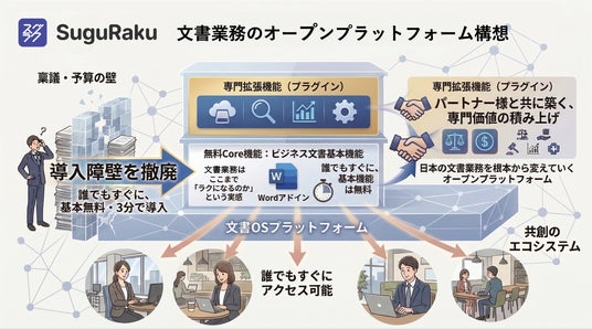 良い業務ツールがあるのに、稟議や予算の壁に阻まれて使えない。この不条理を、私たちは何年もお客様の現場で見てきました。「スグラク」は、その壁そのものをなくす挑戦です。基本機能は無料、営業を介さずに3分で使い始められる。まずは一人でも多くの方に『文書業務はここまでラクになるのか』と実感していただきたい。そして、その体験の先に、パートナー企業の皆様と共に専門領域ごとの価値を積み重ね、日本の文書業務を根本から変えていく――それが、私たちの目指す文書業務のオープンプラットフォームです。