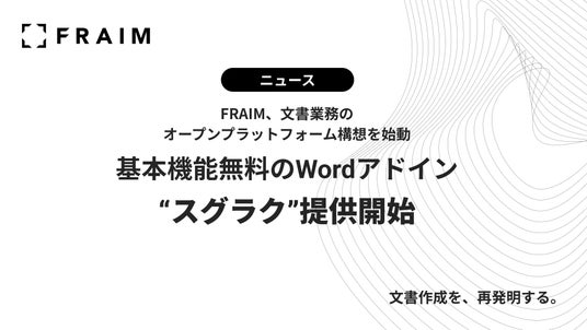 AI文書作成支援のFRAIM株式会社(本社:東京都渋谷区、代表取締役社長:宮坂 豪、以下「FRAIM」)は、この度、「文書業務のオープンプラットフォーム構想」を始動し、その第一弾として、基本機能を無料で提供するMicrosoft Wordアドイン「スグラク」の提供を2026年4月7日より開始いたします。