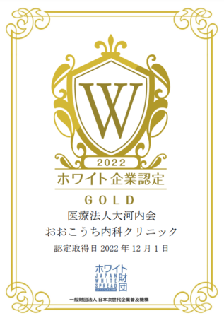 医療法人 大河内会 おおこうち内科クリニックが、一般財団法人日本次世代企業普及機構(通称:ホワイト財団)が運営する「ホワイト企業認定 ゴールド 」を取得しましたことをお知らせいたします。