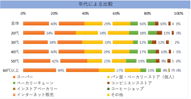 本調査ではこれ以外に、どのようなパンが好きか、最も好きなベーカリーチェーンはどこかなど全34問で回答を得て、年代別、性別、職業別、既婚・未婚別に集計しています。