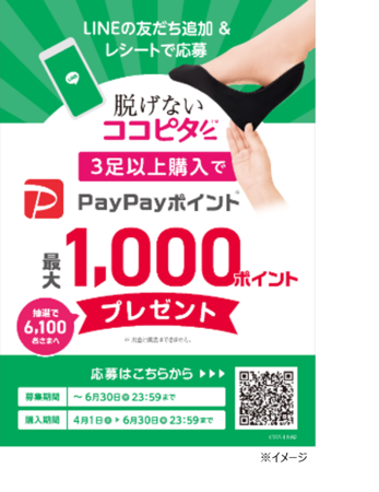 累計販売足数7,000万足を記念して、お客様への感謝を込めたキャンペーンを4月1日(土)より実施します。店頭でココピタを3足以上まとめ買いいただき、レシートを撮影し「LINEで応募」からご応募いただくと、抽選で最大1,000PayPayポイントが当たります。