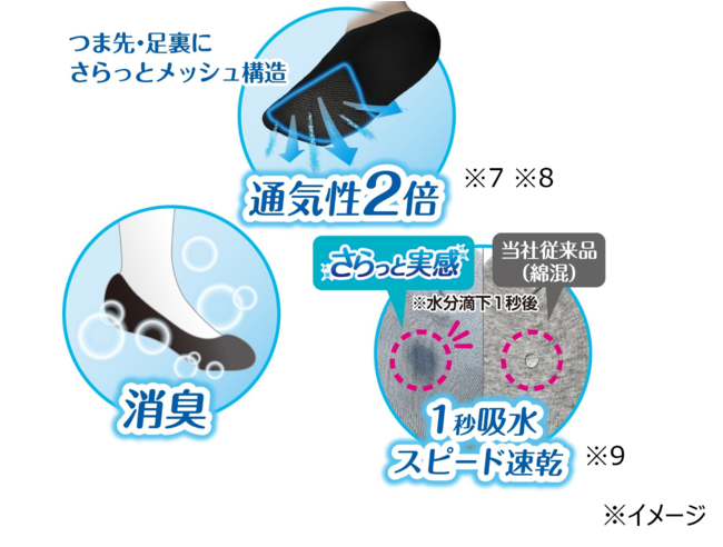 行している状況下では、足汗によって靴の中の湿度は74%以上※6にもなり、雑菌の増殖による“ニオイ”も発生しやすい靴内環境になっていることが確認されました。足がムレた状態のままではベタつきを感じて不快なだけではなく、その“ムレ”が“ニオイ”の原因になってしまうとも言われています。『ココピタプラス さらっと実感』は吸水速乾機能を備えた糸と消臭糸を使用。さらに指の付け根部分と足底部分の「さらっとメッシュ構造」で通気性は従来品の2倍※7※8。汗ムレを軽減するため、1日中さらっとした肌触りで快適に着用いただけます。 ※6…岡本研究開発部門調べ ※7…さらっとメッシュ構造部分データ(従来品比) ※8…試験方法JIS L 1096通気性A法(フラジール形法) ※9…試験方法JIS L 1907吸水速乾性(カケン法)岡本株式会社調べ