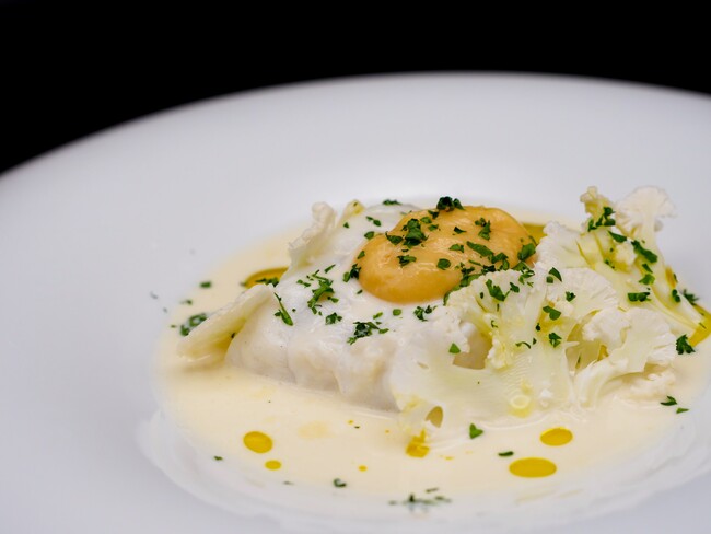 旬を迎えた鱈を昆布締めにし、蒸し焼きにしてカリフラワーのスープ仕立てにいたしました。