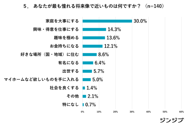最も憧れる将来像について質問したところ、最も多い回答が「家族を大事にする」30%でした。次いで、「趣味・得意を仕事にする」14.3%、「趣味を極める」13.6%、「お金持ちになる」12.1%、「好きな場所(国・地域)に住む」8.6%、「有名になる」6.4%、「出世する」5.7%、「マイホームなど欲しいものを手に入れる」5%、「社会を良くする」が1.4%でした。