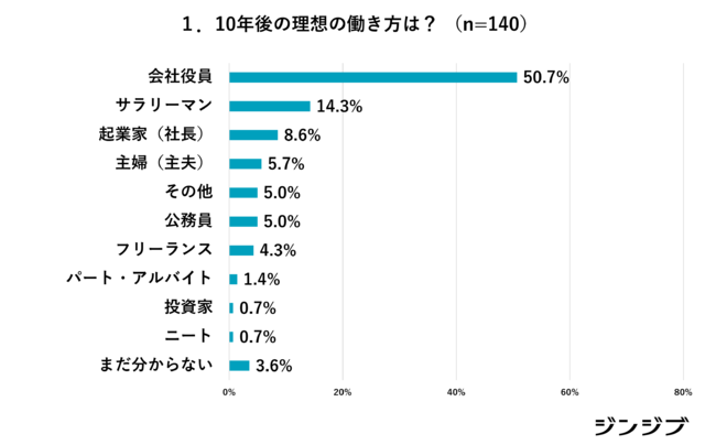 10年後の理想の働き方について質問したところ、なんと半数の方が「会社役員」と回答したことから、出世欲が強いことが分かります。続いて「サラリーマン」が14.3%、「起業家(社長)」が8.6%、「主婦(主夫)」が5.7%、「公務員」が5%、「フリーランス」が4.3%、「パート・アルバイト」が1.4%、「投資家」「ニート」が0.7%でした。