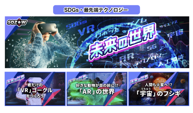 このシリーズでは、VR/ARやAI・ブロックチェーンなどの最新テクノロジーや、宇宙や遺伝子(ゲノム)といった未知の領域への学び、SDGs(国際的な社会課題)など幅広いテーマを通して、これからの世の中について考え探求を深めることができます。