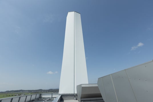 「次世代煙突」はその耐震性や施工性、維持管理の容易性を評価され、2018年にグッドデザイン賞を受賞しました。今回完成した案件は、頂部に向けて四角形から八角形に変形する多面体が特徴であり、白い膜素材による煙突はモニュメントのような高いデザイン性も特徴です。