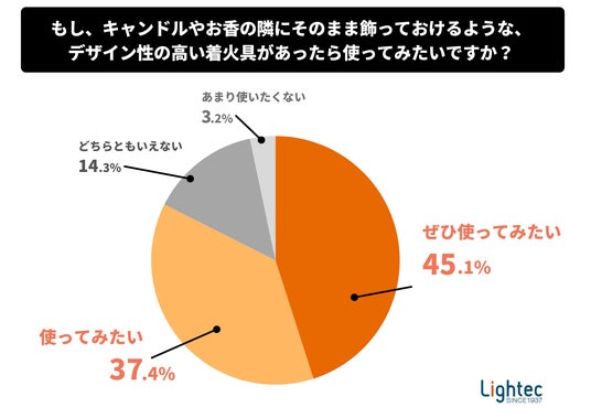 そこで、「キャンドルやお香のそばにそのまま置けるような、デザイン性の高い着火具があったら使ってみたいですか?」という質問に対し、「ぜひ使ってみたい」(45.1%)、「使ってみたい」(37.4%)を合わせると、実に82.5%もの人が使用に前向きであることが判明しました。機能性だけでなく、インテリアの一部として「見せておける」デザインの着火具に対する潜在的な需要が非常に高いことがわかりました。