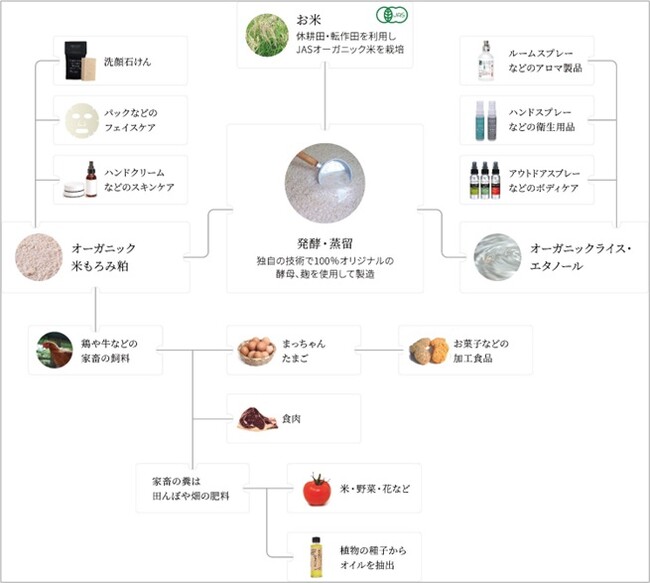 岩手県・奥州市の使われていない田んぼ(休耕田)を耕して育てたオーガニック玄米を丁寧に発酵・蒸留して作ったエタノール、発酵粕である米もろみ粕、つくり手の顔が見えるトレーサブルな原料を用いて、お肌にも環境にもやさしいプロダクトをお届けしています。自然の恵みと発酵のサステナブルなサイクルから生まれる製品は、心地よい毎日を願い、より豊かなライフスタイルを提案。