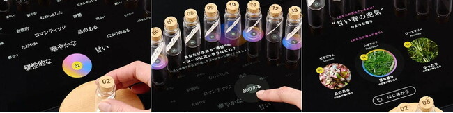 実際の体験では、生活の木で取り扱われている16種類のアロマオイルから、お客様の“好きな香り”3つを選び出すお手伝いをいたします。はじめにデバイスに並んだ16本のボトルの中から KAORIUM がランダムに4つの香りをピックアップ。その中から「いいな」と思った香りを1つ選んでコースターに置くと、AIが香りの印象を表す言葉(「ロマンティック」「品のある」など)を画面に表示します。今度は、その言葉のイメージに近いと思う香りを選んでいくという手順。
