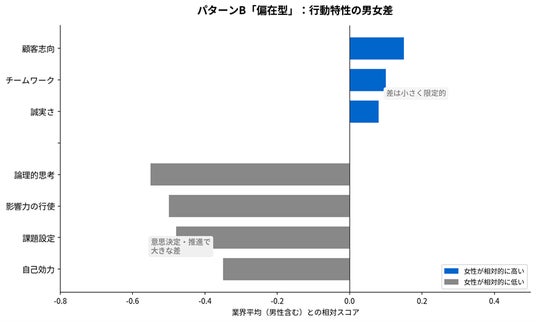 パターンAのような明確な「対外・協働」の強みは見られず、男女差も全体的に小さいものの、自己効力、影響力、論理的思考など、ビジネスをドライブする主要項目において男性側に相対的な優位傾向が見られます。特定の行動様式が評価されやすい構造が、能力開発や機会の偏りを生んでいる可能性を示唆しています。