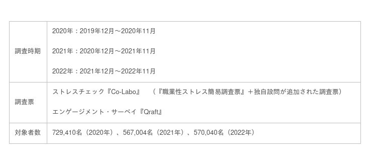 人材の“採用”から“定着”、その先の“活躍”までを支援する人材サービス事業を展開する株式会社ヒューマネージ(本社:東京都千代田区、代表取締役社長:齋藤 亮三、以下ヒューマネージ)は、企業で実施されたストレスチェックおよびエンゲージメント・サーベイの分析結果を発表した。本結果は、ヒューマネージが提供するストレスチェック『Co-Labo』、及びエンゲージメント・サーベイ『Qraft』を2022年に実施した約57万人、さらに3年間の経年データを対象とした計187万人もの大規模な分析調査の結果となる。