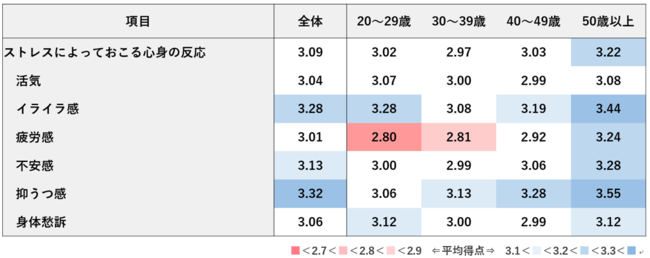 全体として平均的な水準といえるなか、20代、30代の「疲労感」の強さが目立つ。「身体愁訴」(身体の何らかの不調)の値は平均的~やや良い結果といえるので、「身体が悪いわけではないものの、負担感や疲労感が強い」状態といえる。