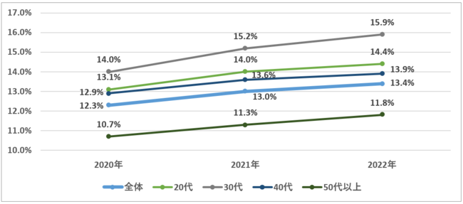 企業で実施されたストレスチェックの結果について、「高ストレス者」の割合を、コロナ禍1年目(2020年)、2年目(2021年)、3年目(2022年)で比較したところ、高ストレス者の割合が増え続けていることがわかった。すべての年代で増加し続けており、コロナ禍の3年間、働く人々のストレス状態は悪化し続けていたと言える。