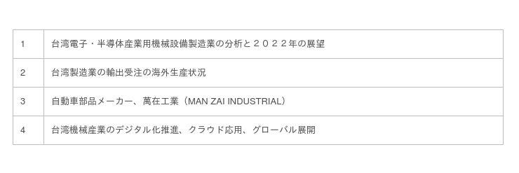 総合すると22年は、世界半導体メーカーの設備支出拡大方針の継続、台湾および中国の液晶パネルメーカーとそのサプライチェーンにおいて新規生産ライン向け投資があるため、台湾当該産業においては販売額の大幅成長、産業景気の上昇傾向を維持できると予測する。