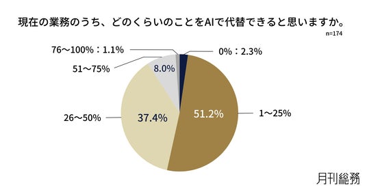 現在の業務のうち、どのくらいのことをAIで代替できると思うか尋ねたところ、半数が「1~25%」と回答しました(n=174)。