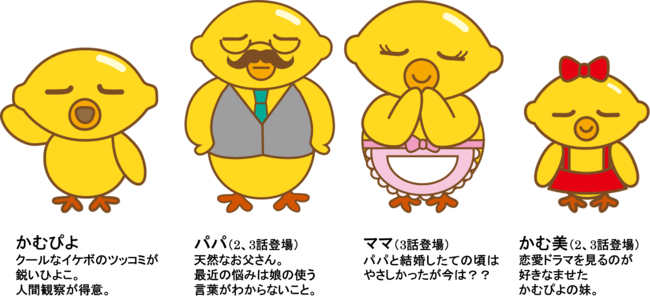 クールなイケボキャラ「かむぴよ」一家と個性的な仲間たちの、ゆるくて“あるある”な日常をショートアニメにしました。全3話。第2話・第3話は絶賛制作中。近日公開予定です。どんな“仲間たち”が共演するかもご注目ください!!