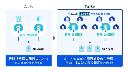 本取り組みでは、医師向け専門医相談サービス「Medii Eコンサル」のネットワークを活用し、治験を担当する医師と組入対象の症例を持つ主治医を効率的につなぎ、治験における被験者募集のスピードと精度を向上させることを目指します。
