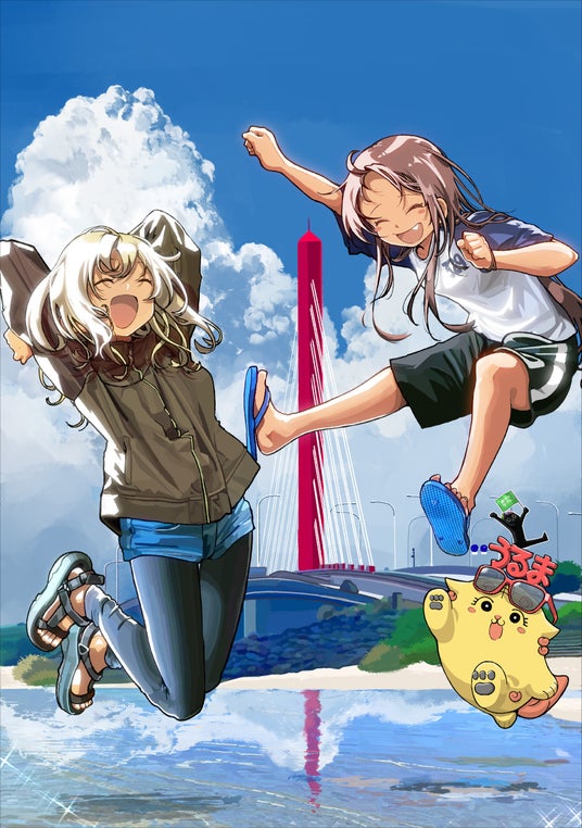 本イラストでは、作品の舞台である沖縄県うるま市の風景を背景に、キャラクターの飛夏と夏菜、沖メモシーサー、さらにうるま市の地域PRキャラクター「うるうらら」が仲良く楽しんでいる様子が描かれています。