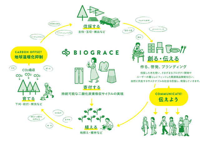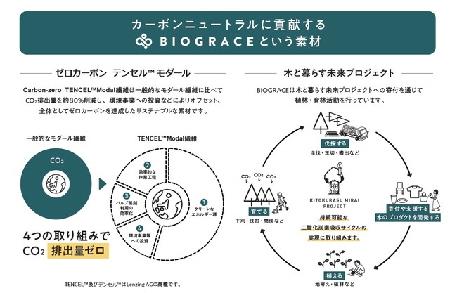 BIOGRACEは生産工程で二酸化炭素排出を抑えたゼロカーボン テンセル™モダール繊維の原料を使用し、2050年までのカーボンニュートラルを目指し、植林・育林活動へのドネーションを通じ、二酸化炭素削減の取り組みを進める新たな環境配慮型素材です。