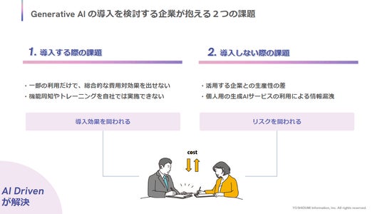 導入しないことによる課題: 活用企業との生産性向上機会の損失、個人用生成 AI サービスの利用による情報漏洩リスク(シャドーAI)などを解決します。