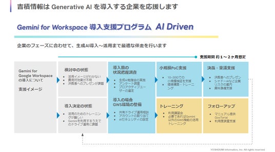 吉積情報株式会社(本社:東京都千代田区、代表取締役社長:秋田晴通、以下、吉積情報)は、Google Cloud が提供する生成 AI サービス「Gemini for Workspace」の導入支援プログラム「AI Driven」の提供を開始します。