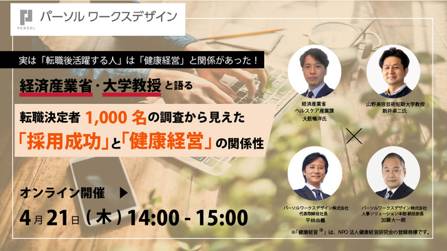 総合人材サービスのパーソルグループで、BPO、ヘルプデスク/コールセンターのアウトソーシングなどを手掛けるパーソルワークスデザイン株式会社(本社:東京都豊島区、代表取締役社長:平林 由義、以下パーソルワークスデザイン)は、4月21日(木)人事ご担当者向けに、「転職」と「健康経営」に関する調査結果から見えた健康経営が採用活動に与える影響についてウェビナーを開催します。